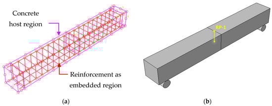 (a) Embedded reinforcement and host beam; (b) boundary conditions and load application.