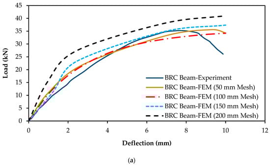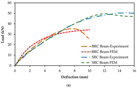 The load–deflection curves derived from both experimental testing and FEM analyses of the SRC and BRC beams exhibited a high degree of similarity, indicating a strong agreement between the experimental and FEM outcomes, as summarized in Table 4.