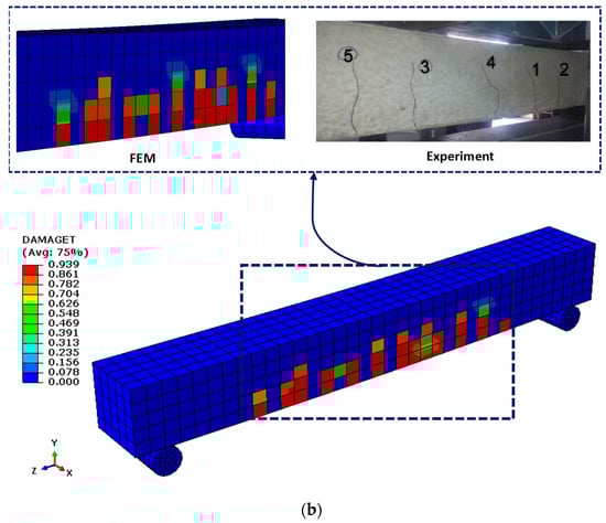 (a) Comparison of load–deflection responses of FEM and experimental study []; (b) comparison of failure patterns between FEM and experimental results [] for BRC beam.