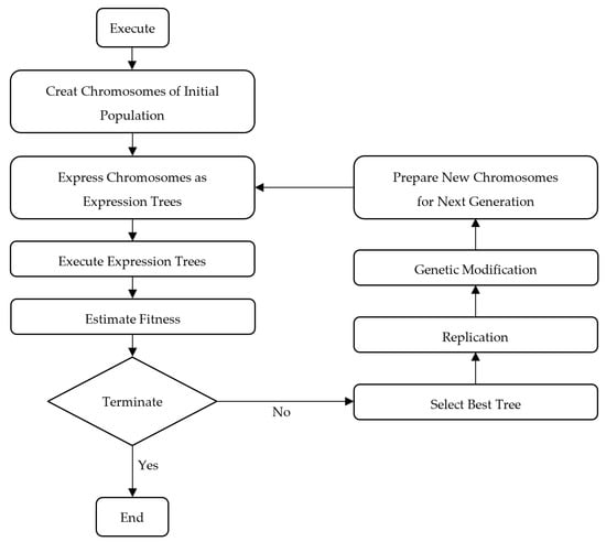 GEP is a type of genetic algorithm (GA) used to construct mathematical models from input data in a domain-independent manner. Unlike traditional GAs and genetic programming (GP), GEP employs a distinctive chromosome representation. While GAs utilize linear strings of constant length and GP uses various nonlinear entities of varying sizes and shapes [,], GEP stands out by combining a fixed-length linear string with a branching structure that can vary in size and shape.