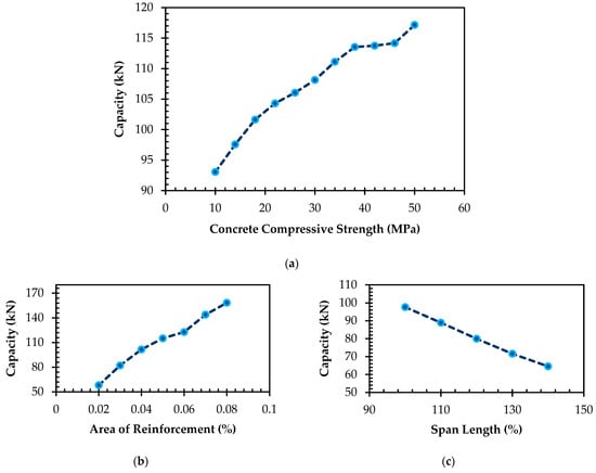 According to Figure 9c, the beam’s capacity showed a declining trend with an increase in the span length. This phenomenon can be attributed to the fact that a beam with an extended span would endure heightened tensile stresses, ultimately leading to a diminished capacity. As an example, the analysis revealed that a beam with the span length of 5 m resulted in the capacity of 100 kN. Conversely, a beam with the identical cross-sectional dimension and reinforcements but featuring the extended span length of 10 m registered the reduced capacity of 75 kN, signifying the noteworthy 25% decrement.