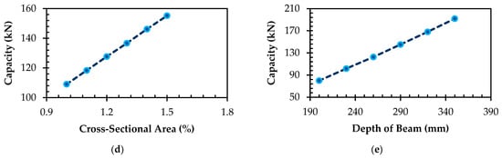 As observed in Figure 9d,e, a discernible linear relationship was established between the flexural capacity of a beam and its respective cross-sectional area and depth.