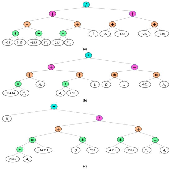 where L and D designate the length and depth of the beam, respectively, f’c represents the concrete compressive strength, and Ar and Ac denote the areas of reinforcements and cross-section, respectively. The graphical representation of the estimation model’s expression tree is also presented in Figure 10 along with the parameters for construction of the model listed in Table 6.