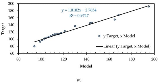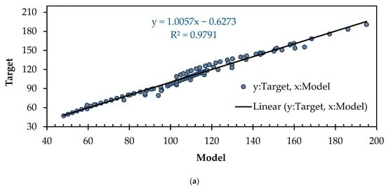 An R2 value approaching 1 indicates a precise prediction. The statistical assessment of the model’s performance, in comparison to the numerical results referred to as ‘‘target’’, is illustrated in Figure 11. An examination of R2 provided a value of 0.98 for the training dataset and 0.97 for the validation dataset.