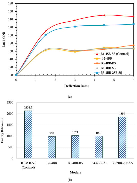 The numerical model was further evaluated by comparing the energy absorption and failure pattern of all the beams. The calculation of the energy absorption for all the models was conducted by examining the area beneath the load–deflection curve, as displayed in Figure 12b. Figure 13b presents a comparative analysis of the decrease in the energy absorption for all the models in relation to the control model (B1-4SB-SS). The energy absorption for B1-4SB-SS was 2134.3 kN-mm, however, it was 988.13 kN-mm for B2-4BB, which was 54% less than that of B1-4SB-SS. Similarly, the energy absorption values for B3-4BB-BS and B4-4BB-SS were 1023.7 kN-mm and 1000.7 kN-mm, respectively. B5-2BB-2SB-SS had an energy absorption of 1859.27 kN-mm, which was about 13% less than that of B1-4SB-SS.