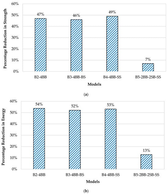 (a) Comparison of strength reduction percentage for all beams in comparison to control beam (B1-4SB-SS); (b) comparison of energy reduction of all models with respect to B1-4SB-SS.
