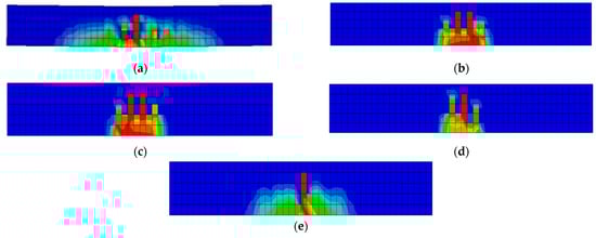 Regarding the distribution of the tensile damage, B1-4SB-SS experienced damage spread over a larger area, as depicted in Figure 14a. Conversely, B2-4BB, B3-4BB-BS, and B4-4BB-SS illustrated the tensile damage that was distributed over considerably smaller areas when compared to B1-4SB-SS. These distributions are displayed in Figure 14b–d, respectively. Interestingly, the tensile damage for B5-2BB-2SB-SS was very similar to B1-4SB-SS, as shown in Figure 14e. These findings suggest that B5-2BB-2SB-SS could be a suitable replacement for B1-4SB-SS, offering an economically and environmentally friendly alternative.