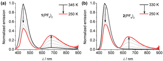 To investigate the changes in dual-emissive properties by temperature stimuli, the temperature-dependent emission spectral studies of the representative complexes 1(PF6)2 and 2(PF6)2 have been measured in CH3CN solution and shown in Figure 3. Both of the complexes display similar emission spectral changes. Upon decreasing the temperature from 345 to 250 K, the higher-energy emission intensities decrease significantly, while those of the lower-energy emissions gradually increase. During the spectral changes process, a well isoluminescence point was recorded at 576 and 566 nm for 1(PF6)2 and 2(PF6)2, respectively. The excited-state lifetimes of the higher-energy emission bands of these complexes still fall in the nanosecond range from 345 to 250 K, excluding a thermally activated process. This suggests that the Franck–Condon transitions of the higher-energy emission are slowed down upon decreasing the temperature and thus facilitate the intersystem crossing from 1LLCT/1ICT to the 3MLCT state [69]. The relative intensity of the two emission bands of 1(PF6)2–3(PF6)2 vary as a function of the excitation wavelength (Figure S17). When excited at a shorter wavelength (300–360 nm), the higher-energy emission band is much higher than the lower-energy emission band. When a longer excitation wavelength was applied (380–500 nm), the higher-energy emission band almost disappeared, and the lower-energy emission band became dominant.
