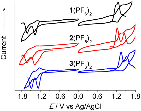 Cyclic and differential pulse voltammograms of 1(PF6)2–3(PF6)2 at a scan rate of 100 mV/s in 0.1 M Bu4NClO4/CH3CN.