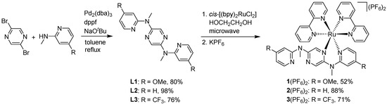 Three N(CH3)-bridged ligands L1–L3 and corresponding mononuclear ruthenium complexes 1(PF6)2–3(PF6)2 were synthesized as outlined in Scheme 1. The bidentate ligands L1–L3 were obtained through a Pd-catalyzed C-N coupling reaction of 2,5-dibromopyrazine with 2-(N-methylamino)pyridine derivatives in the range of 76−98% yields [64,65]. The reaction of L1, L2, and L3 with 1 equiv. cis-[Ru(bpy)2Cl2] under microwave irradiation, followed by anion exchange using potassium hexafluorophosphate, provided complexes 1(PF6)2, 2(PF6)2, and 3(PF6)2 in a 52%, 88%, and 71% yield, respectively. These new compounds were fully characterized by nuclear magnetic resonance (NMR) (Figures S1–S8), mass spectrometry (Figures S9–S11), and elemental analysis. Furthermore, high performance liquid chromatography (HPLC) analysis results indicate that these complexes have high purities (Figure S12).