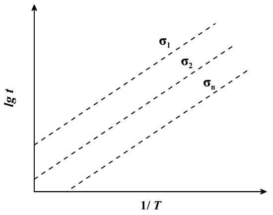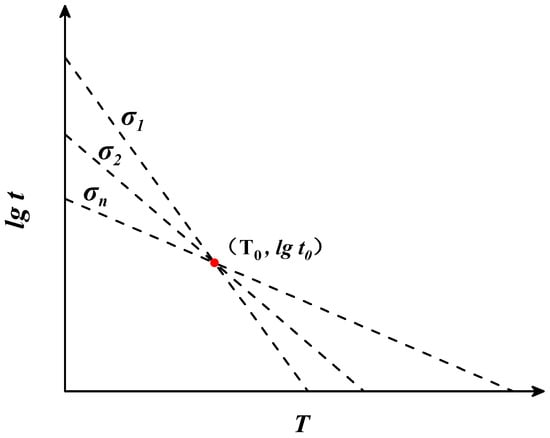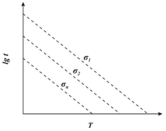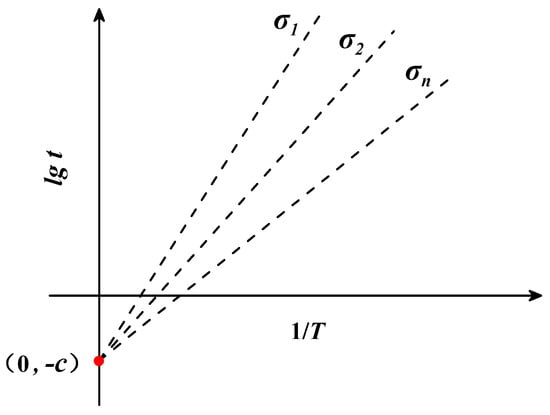 where is the fracture time (h), is the temperature (K), is a constant determined by creep test data, and is a function of the stress . When the stress is certain, is a definite value and the relationship between and is linear. When a linear function passes through the fixed point (0, ), the value of the constant can be obtained by solving for the intercept of the linear function. The relationship between and is depicted in Figure 1.