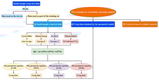 Four classical time–temperature parametric models are used to obtain parametric equations of temperature , stress and creep life . Then, the creep fracture time data of other conditions obtained from parametric equations are expanded into the training set of machine learning models to realize the combination of the time–temperature parametric models and the machine learning models.