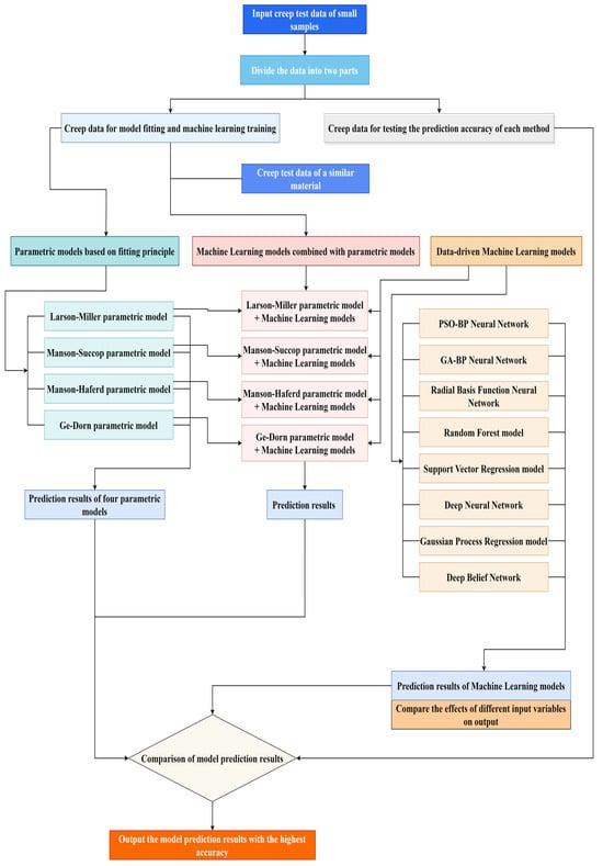 By converting the creep test data for fitting-related application to the − coordinate system, the time–temperature parametric model can always obtain a curve prediction function with a high fitting degree in relation to the test data. The machine learning models can train creep test data through different algorithm theories, predict the creep rupture life under different conditions, and quantify the influence of different input variables on the output for comparison. Due to the different theories of various models in the two methods and their different applicability to varied materials, the prediction ability of each model for different types of creep data is always varied. The current research always focuses on using one of the two methods in prediction in order to find the model with the strongest prediction ability and apply it to the prediction of material creep rupture life. Researchers do not account for the different applicability of each model to a variety of materials. A model with a strong prediction ability for one material may not have similar utility when making forecasts about other materials. It is not guaranteed that a certain model always has the strongest prediction ability for a variety of materials.