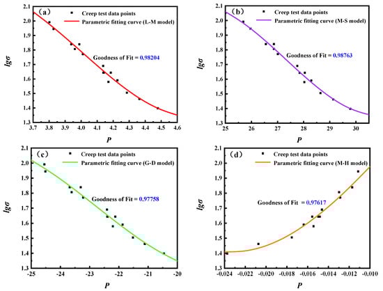 Manson and Succop [37] found that, under certain stress conditions, the logarithmic creep fracture time of the material tends to be linear with the temperature . Based on this observation, they proposed the Manson–Succop parametric model, which converts temperature and logarithmic fracture time into the parameter . Similar to the L-M model, the M-S model converts the creep test data at different temperatures and stress conditions into a series of points in a two-dimensional right-angle coordinate system ( − ). A curve can be obtained by fitting this series of points, which is a cubic function. This curve is then used to predict the creep fracture time of the material under other temperature and stress conditions. The mathematical equations of the M-S model are as follows: