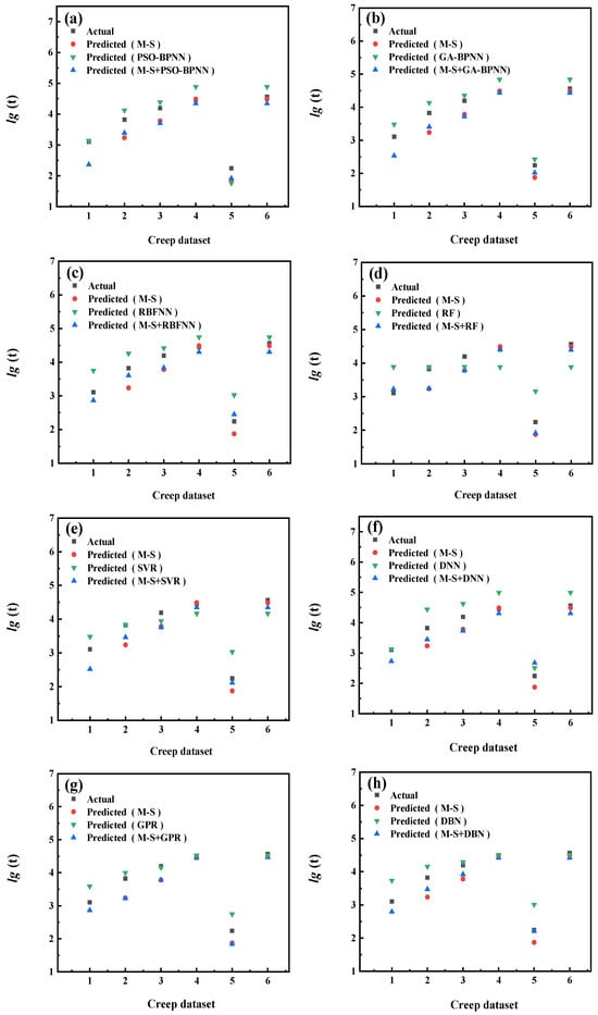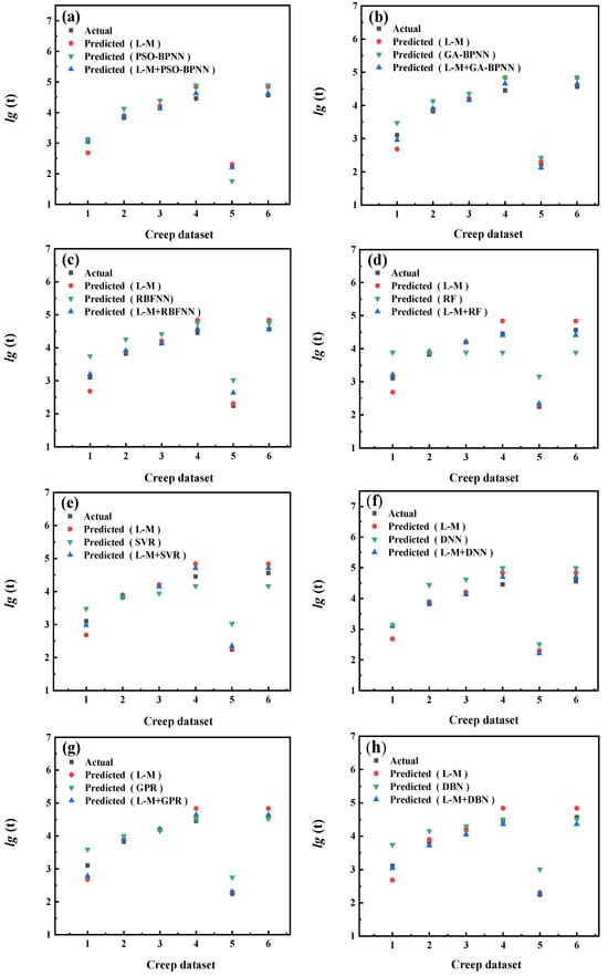 From the statistical values shown in Table 3, it is possible to observe the L-M model with the highest prediction accuracy and the M-H model with the lowest prediction accuracy among the four time–temperature parametric models for this set of Cr-Mo alloy creep data. Among the eight machine learning models, the GA-BPNN model has the highest prediction accuracy. Among the 32 composite models, the L-M+PSO-BPNN composite model possesses the highest prediction accuracy. Furthermore, among these models of three categories of methods, the most accurate one is the L-M+PSO-BPNN composite model.