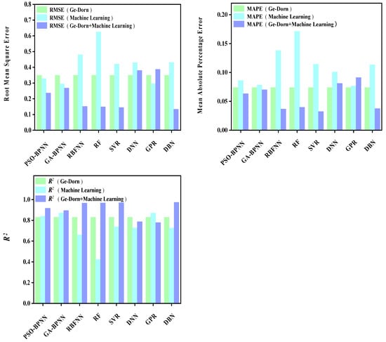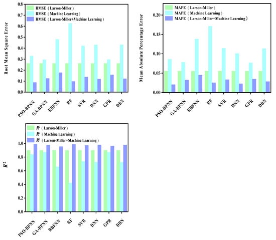 After the predicted values of each model are obtained, three quantitative evaluation indicators are calculated for each model through the experimental values and predicted values. Figure 10 shows the values of three evaluation indicators of each model, namely, RMSE, MAPE, and R2. Figure 9 and Figure 10 show that, compared with the machine learning models, the model prediction results obtained by combining the L-M parametric model with various machine learning models are more accurate. Further, their predicted values are closer to those of actual test values.