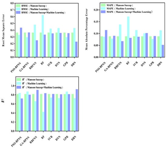 We calculated the values of evaluation indicators for each model in the creep rupture life prediction system, and the results are shown in Table 3, which show the values of evaluation indicators RMSE, MAPE, and R2 of each model in three categories of methods (time–temperature parametric models/machine learning models/composite models).