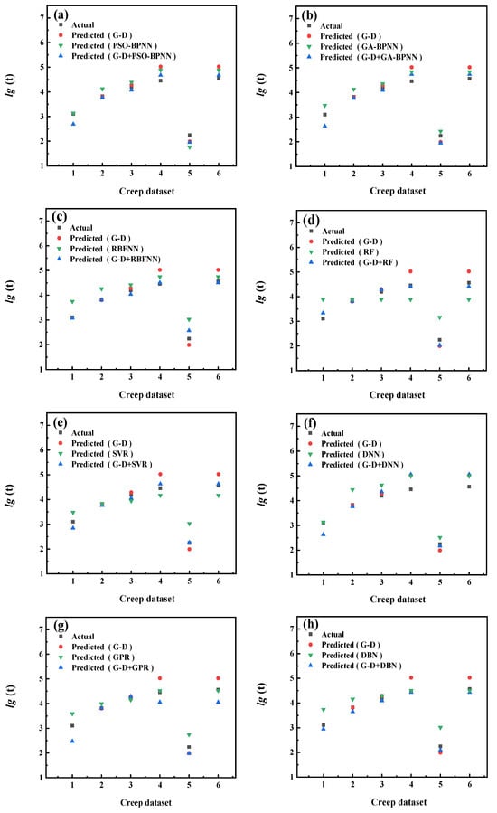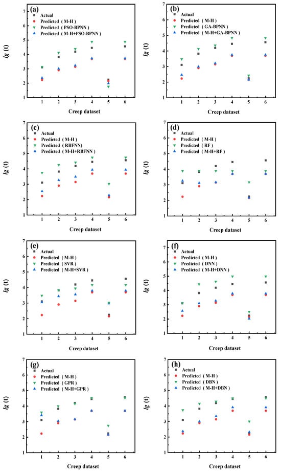 Figure 9 shows the actual test values and the predicted values of three categories of methods (L-M model/machine learning models/L-M+ machine learning models). The L-M model uses 15 sets of creep test data of 5Cr-0.5Mo, the machine learning model uses creep test data of 5Cr-0.5Mo, and the creep test data of another material, 1Cr-0.5Mo. L-M+ machine learning models use three parts of data, namely, small-sample creep test data of 5Cr-0.5Mo, creep test data of 1Cr-0.5Mo, and creep data expanded using the L-M parametric model. The actual values shown in Figure 9 are another 6 sets of creep test data in 21 sets of 5Cr-0.5Mo.