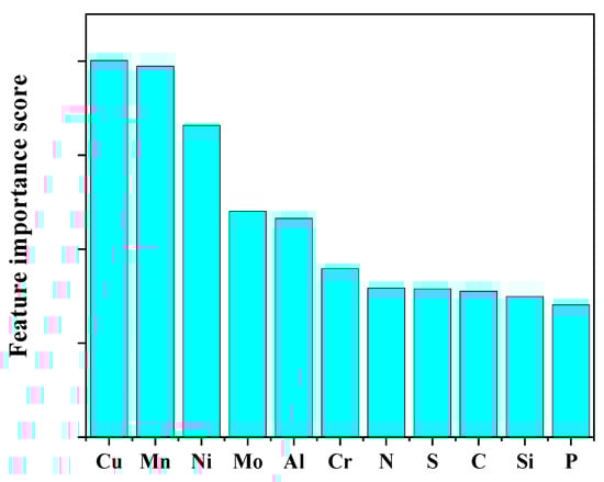 The influence of different input variables on the creep rupture life of 5Cr-0.5Mo and 1Cr-0.5Mo alloys is shown in Figure 17. It can be seen from Figure 17 that the top five alloy elements with high feature importance scores are Cu, Mn, Ni, Mo, and Al, indicating that the mass fraction content of these five elements has a more substantial effect on alloy creep rupture life than the other six elements.