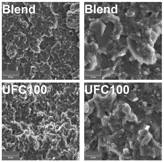 The introduction of unmodified UFC100 cellulose filler resulted in a significant increase in the roughness of samples’ cryofractured surfaces, which can be attributed to the shape of particles (Figure 1). AFM images indicated a noticeable increase in surface area and roughness compared to the unfilled blend, which required enhancing the magnitude of the phase shift angle. Moreover, the AFM image of the UFC100 sample points to the void resulting from the ripping out of the cellulose particle during sample preparation with ultramicrotome. Combined with the very smooth character of the interfacial area and the particles’ agglomeration and singular pull-outs indicated by the SEM images, it confirms the insufficient compatibility between the applied polymer matrix and the introduced filler resulting from the hydrophilicity gap, as suggested by the WCA values.