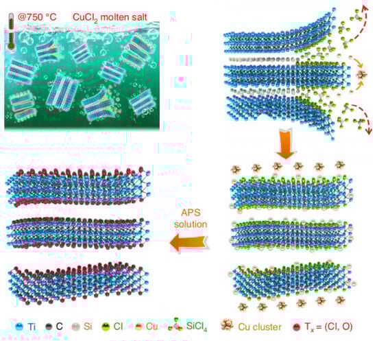 - Alhabeb, M.; Maleski, K.; Mathis, T.S.; Sarycheva, A.; Hatter, C.B.; Uzun, S.; Levitt, A.; Gogotsi, Y. Selective Etching of Silicon from Ti3SiC2 (MAX) To Obtain 2D Titanium Carbide (MXene). Angew. Chem. Int. Ed. Engl. 2018, 57, 5444–5448. [Google Scholar] [CrossRef] [PubMed]