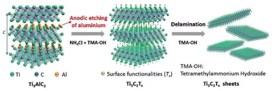 - Naguib, M.; Kurtoglu, M.; Presser, V.; Lu, J.; Niu, J.; Heon, M.; Hultman, L.; Gogotsi, Y.; Barsoum, M.W. Two-dimensional nanocrystals produced by exfoliation of Ti3AlC2. Adv. Mater. 2011, 23, 4248–4253. [Google Scholar] [CrossRef] [PubMed]