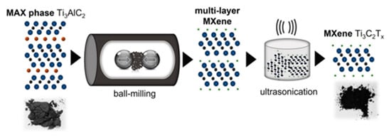 - Ljubek, G.; Kralj, M.; Kraljić Roković, M. Fluorine-free mechanochemical synthesis of MXene. Mater. Sci. Technol. 2023, 39, 1645–1649. [Google Scholar] [CrossRef]
