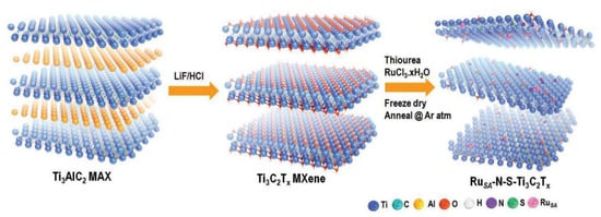 - Peng, W.; Luo, M.; Xu, X.; Jiang, K.; Peng, M.; Chen, D.; Chan, T.S.; Tan, Y. Spontaneous Atomic Ruthenium Doping in Mo2CTX MXene Defects Enhances Electrocatalytic Activity for the Nitrogen Reduction Reaction. Adv. Energy Mater. 2020, 10, 2001364. [Google Scholar] [CrossRef]
