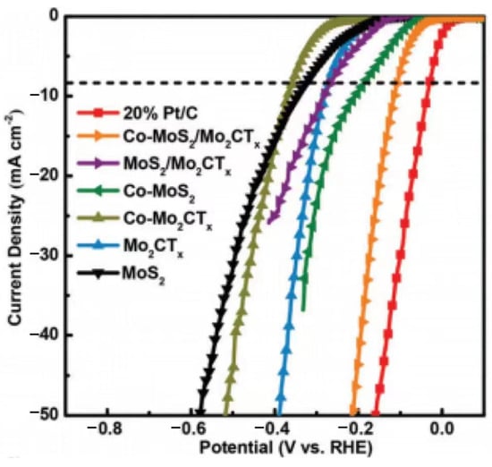 - Seh, Z.W.; Fredrickson, K.D.; Anasori, B.; Kibsgaard, J.; Strickler, A.L.; Lukatskaya, M.R.; Gogotsi, Y.; Jaramillo, T.F.; Vojvodic, A. Two-Dimensional Molybdenum Carbide (MXene) as an Efficient Electrocatalyst for Hydrogen Evolution. ACS Energy Lett. 2016, 1, 589–594. [Google Scholar] [CrossRef]