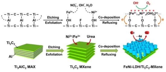 - Tian, M.; Jiang, Y.; Tong, H.; Xu, Y.; Xia, L. MXene-Supported FeCo-LDHs as Highly Efficient Catalysts for Enhanced Electrocatalytic Oxygen Evolution Reaction. ChemNanoMat 2019, 6, 154–159. [Google Scholar] [CrossRef]