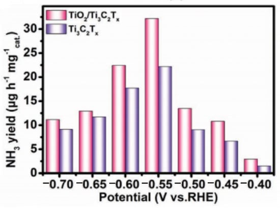 - Fang, Y.; Liu, Z.; Han, J.; Jin, Z.; Han, Y.; Wang, F.; Niu, Y.; Wu, Y.; Xu, Y. High-Performance Electrocatalytic Conversion of N2 to NH3 Using Oxygen-Vacancy-Rich TiO2 In Situ Grown on Ti3C2Tx MXene. Adv. Energy Mater. 2019, 9, 1803406. [Google Scholar] [CrossRef]