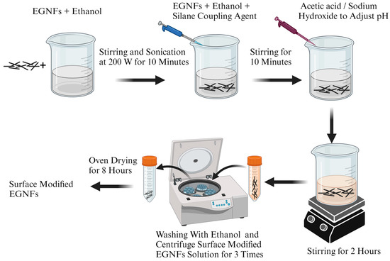 Three different silane coupling agents with increasing chain lengths, including MTMS, APTES, and GPTMS, were employed to modify the surface of the prepared EGNFs. In addition, a combination of silane coupling agents, i.e., APTES+GPTMS, was also employed to functionalize the EGNFs with even longer chain lengths. During the surface modification process (Figure 1), the EGNFs were first dispersed in ethanol at a weight fraction of 1.5 wt.%. The resultant suspension was subjected to a vigorous ultrasonication via a 500 W ultrasonic probe sonicator (QSONICA, Newtown, CT, USA) at 40% power for 5 min to achieve a uniform dispersion of the EGNFs in ethanol. Subsequently, a corresponding silane coupling agent was added into the EGNF/ethanol dispersion at a concentration of 2 wt.%, followed by stirring at 600 rpm for 10 min. The pH of the reaction system was maintained at 4–5 by the addition of acetic acid for the APTES and MTMS, and at 10–11 by using 0.1 M NaOH solution for the GPTMS. The reaction of the EGNF surface modification was carried out for 2 h with continuous stirring at 600 rpm. Subsequently, the surface-functionalized EGNFs (MTMS–EGNFs, APTES–EGNFs, and GPTMS–EGNFs) were acquired by centrifugation and thoroughly washed three times with ethanol to remove the physically adsorbed silane molecules. To surface-modify the EGNFs with APTES+GPTMS, the EGNFs were first surface-modified with APTES and the obtained APTES–EGNFs were used as the starting material for further GPTMS modification, following the same procedure as mentioned above to obtain APTES–GPTMS-functionalized EGNFs (APTES–GPTMS–EGNFs). The commercial GNPs were also surface-modified using the same procedure to obtain MTMS–GNPs, APTES–GNPs, GPTMS–GNPs, and APTES–GPTMS–GNPs for comparison with the surface-modified EGNFs. All the surface-modified EGNFs and GNPs were dried in a vacuum oven at 60 °C for 8 h before further use.