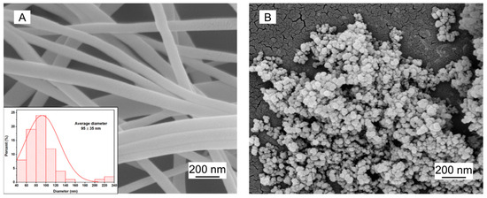 The EGNFs were collected in the form of non-woven mat and exhibited a good cylindrical fiber shape (Figure 2A). The diameters of the EGNFs varied from a minimum size of 50 nm to a maximum size of 240 nm, with an average diameter of 95 ± 35 nm. The commercial GNPs exhibited a spherical shape, with an average size of 20 nm according to the product specifications. The agglomeration of GNPs was observed, and some GNP agglomerates could even fall into the micrometer range.