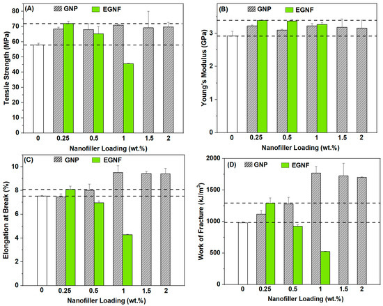 Figure 3. Tensile strength (A), Young’s modulus (B), elongation at break (C), and work of fracture (D) of neat epoxy (control sample) and reinforced epoxy nanocomposites with pristine EGNFs and GNPs.