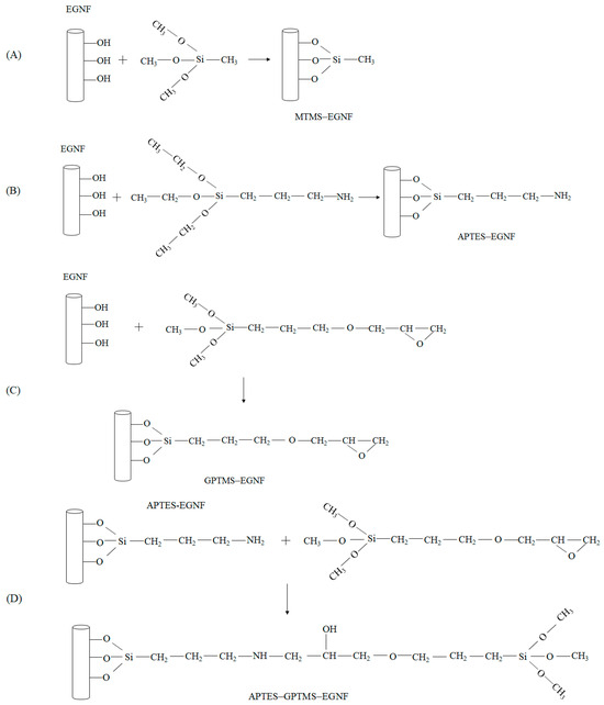 Figure 4. Schematic illustration of possible reactions between EGNFs and silane coupling agents: (A) MTMS; (B) APTES; (C) GPTMS; (D) APTES–GPTMS.