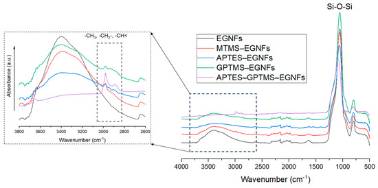 FTIR was used to characterize the surface-modified EGNFs to confirm the graft of various silane molecules on the nanofiber surface. The FTIR spectra of the pristine EGNFs, MTMS–EGNFs, APTES–EGNFs, GPTMS–EGNFs, and APTES–GPTMS–EGNFs are compared in Figure 5. All the silane-treated EGNFs showed typical –CH3, –CH2–, and –CH < peaks in the range of 2800 cm−1–3000 cm−1, while the pristine EGNFs did not show any peaks in that range, indicating the successful graft of silane molecules on the surface of the EGNFs.