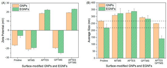 Figure 6. Average zeta potential (A), and average size (B) of pristine and surface-modified EGNFs and GNPs via DLS.