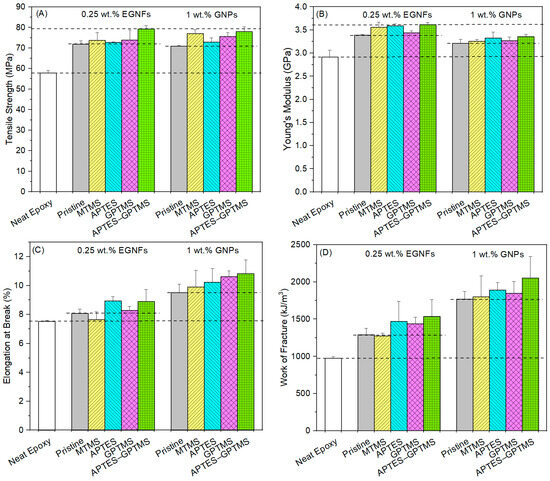 Figure 7. Tensile strength (A), Young’s modulus (B), elongation at break (C), and work of fracture (D) of neat epoxy (control sample) and epoxy nanocomposites reinforced with surface modified EGNFs at 0.25 wt.% and surface-modified GNPs at 1 wt.%.