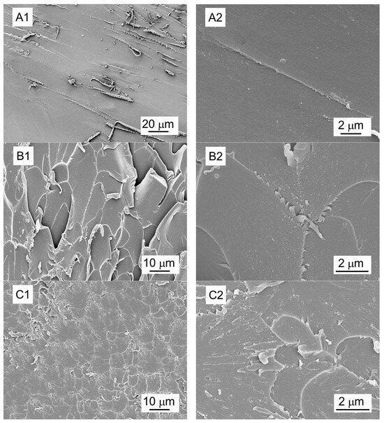 We observed that the neat epoxy (Figure 8A) exhibited a relatively smooth surface, with only a few discernible fracture lines that were oriented along the direction of crack growth, indicating low toughness. In comparison, as shown in Figure 8B,C, the epoxy nanocomposites with the pristine EGNFs and GNPs at 0.25 wt.% and 1 wt.% loadings, respectively, showed rough surfaces and multi-plane fracture lines, attributing to a tougher interface between the epoxy matrix and the nanofillers and, consequently, better mechanical properties than those of the neat epoxy.