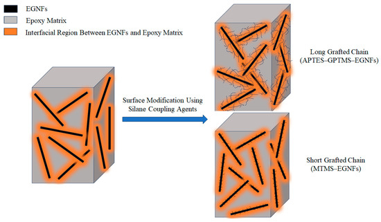 Overall, the surface-modified EGNFs provided great potential to reinforce epoxy resin. Longer grafted silane molecular chains on the surface of EGNFs could lead to stronger interfacial bonding between EGNFs and epoxy matrix, a result of stronger molecular entanglement (Figure 9). The whole mechanical performance of EGNF-reinforced epoxy nanocomposite is determined by comprehensive and balanced EGNF-epoxy interactions from the length of surface-grafted molecules, the “bridging” effect, and the agglomeration of EGNFs. In this research, the EGNFs exhibited adverse effects on reinforcement, due to the extent of agglomeration at loadings beyond 0.5 wt.%. Reducing the agglomeration of EGNFs is the key to future successful employment of EGNFs for highly efficient reinforcing purposes.