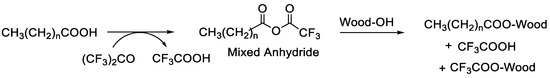 Acyl chloride, a fatty acid derivative, is widely used in wood thermoplasticization due to its reactivity in wood esterification, though hydrogen chloride is released as a byproduct in the reaction. Fatty acids, on the other hand, do not react easily with the hydroxyl groups of wood. Arni et al. introduced the utilization of trifluoroacetic anhydride (TFAA) as an impelling agent to esterify dicarboxylic acids in wood, using benzene as a solvent to improve wood hydrophobicity [12]. The work was continued by Shiraishi et al. [13] and Nakano [14], using fatty acids as esterifying agents and TFAA in benzene to obtain thermoplastic materials.