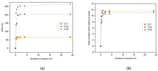 Figure 3. WPG (a) and ester content (b) of modified wood in different reaction durations.