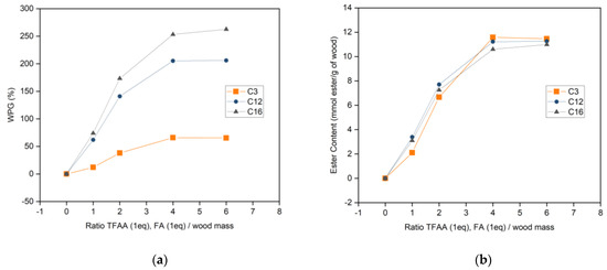 The ester content (in mmol of ester per gram of wood) was calculated from the mass of reactant grafted on the wood per gram of wood divided by the molecular mass of fatty acid used for esterification (M) minus 18, which corresponded to the molecular mass of water released during esterification, using Equation (2) [21]: