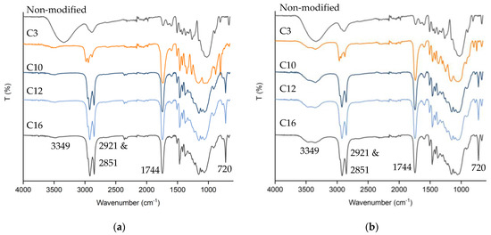Fourier transform infrared spectroscopy (FTIR) analysis was performed to establish the chemical structure transformation due to esterification. As presented in Figure 5, a significant decrease in the O-H stretching vibration band at 3349 cm−1 was observed for all lengths of fatty acid chain grafted to the esterified wood without solvent. However, the O-H stretching vibration peak was still observed in the esterified sample in the presence of CH2Cl2, indicating that more hydroxyl groups of wood were successfully esterified, confirming the higher WPG obtained without solvent. Successful esterification was confirmed with the appearance of three new peaks, first at 1744 cm−1, which corresponded to the adsorption of C=O carbonyl ester groups with relatively uniform intensity, confirming uniform ester content in each fatty acid used. Second peaks observed at 2921 and 2851 cm−1 corresponding to symmetric and asymmetric chains (–CH2–) [6,23,24,25,26] were present in different intensities corresponding to the length of fatty chains grafted. The third new peak at 720 cm−1 could be assigned to the characteristic of at least four linearly connected methylene (–CH2–) groups [8] in capric-, lauric-, and palmitic-acid-esterified wood.