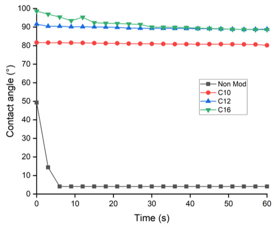 Figure 8 presents the hydrophobic aspect of esterified film by measuring the contact angle of the water droplet and pressed film surface. The low contact angle formed on the surface of the wood sheet before esterification shows a hydrophilic aspect, indicating the hygroscopic properties of native wood. Drastic improvement of the contact angle obtained in the esterified film was shown by the high and stable contact angle between 80 and 90° at the end of the measurement. Longer fatty acid chain esterification showed a slightly higher contact angle than shorter fatty acid analogs. The high contact angle obtained in esterified film demonstrated that fatty acid esterification of wood enhanced surface hydrophobicity and confirmed the elimination of free hydroxyl groups shown by FTIR data.