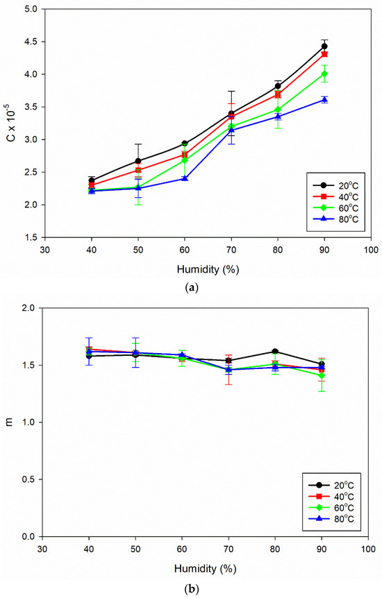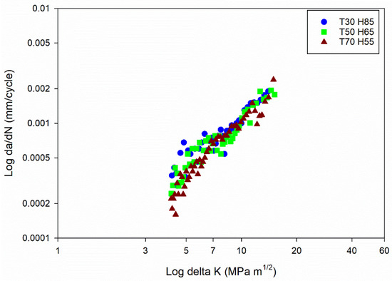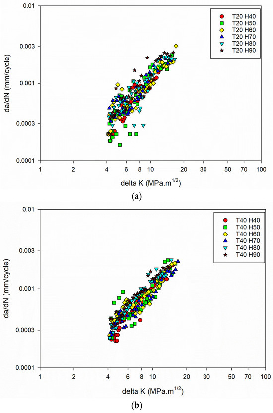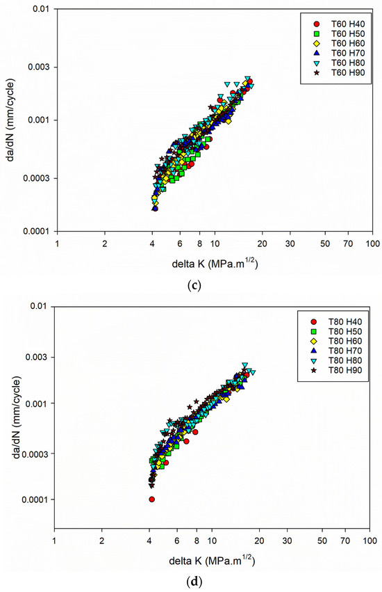 The constant m values as humidity increases indicate that the material’s crack growth behaviour remains consistent, and that the da/dN vs. ΔK curves (Figure 3a–d) remain almost the same for different humidity conditions.