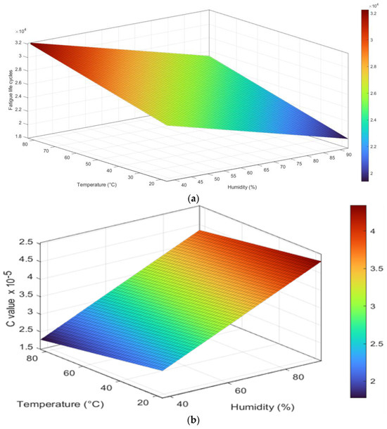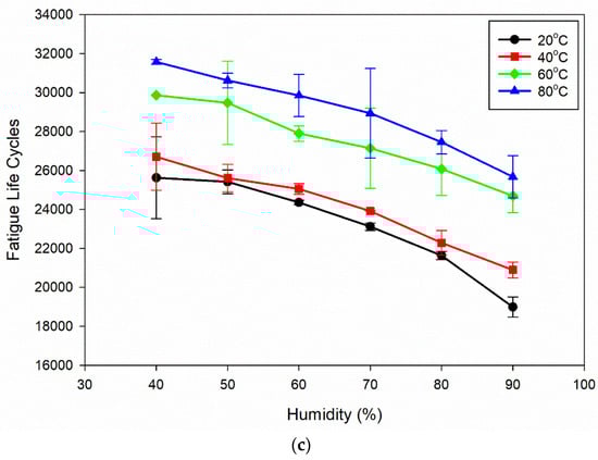 The information presented in Figure 4c shows that the fatigue life cycles decrease as the humidity increases from 40% to 90%. As humidity increases from 40% to 90%, the fatigue life cycles decrease, indicating a detrimental effect on the material’s fatigue life. High humidity increases moisture content, accelerating corrosion and promoting crack initiation and propagation. Moisture is corrosive, weakening the material and reducing fatigue life. Additionally, moisture can facilitate hydrogen embrittlement, contributing to crack growth and reduced fatigue life. Increased corrosion and hydrogen embrittlement under higher humidity levels makes the material susceptible to crack propagation and failure under cyclic loading conditions.