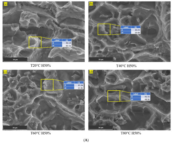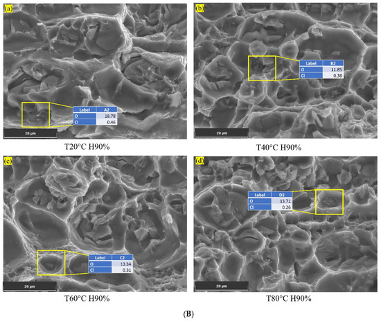 (A) Oxide layer on surface of the Al6082 alloy at low humidity and different temperatures. (B) Chlorine on the corroded surface of the Al6082 alloy at high humidity and different temperatures.