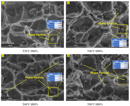 Hydrogen embrittlement (HE) is common in various aluminium alloy series when exposed to humid environments [28]. However, the HE sensitivity is generally low in the Al6xxx series. Despite this, certain Al6xxx series alloys, such as Al6082, remain susceptible to HE even under high humidity conditions [5]. At high temperatures, particularly at 80 °C and high humidity, secondary phase particle formation, such as Mg2Si, is likely in the alloy microstructure. These particles accumulate within the micro-void regions, impeding hydrogen diffusion activity [56]. As a result, hydrogen absorption at the Al6082 alloy’s surface is reduced, as illustrated in Figure 11.