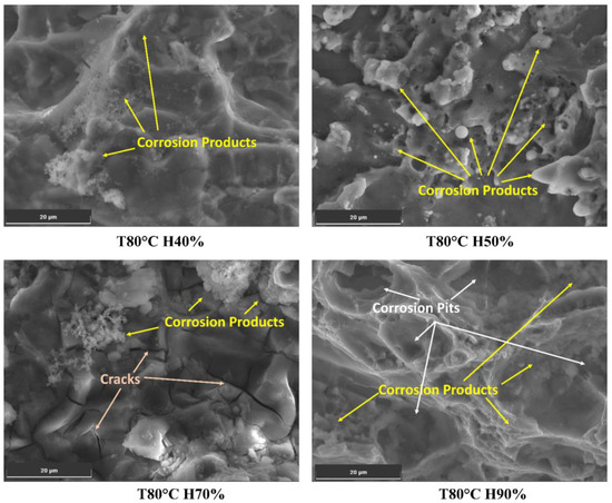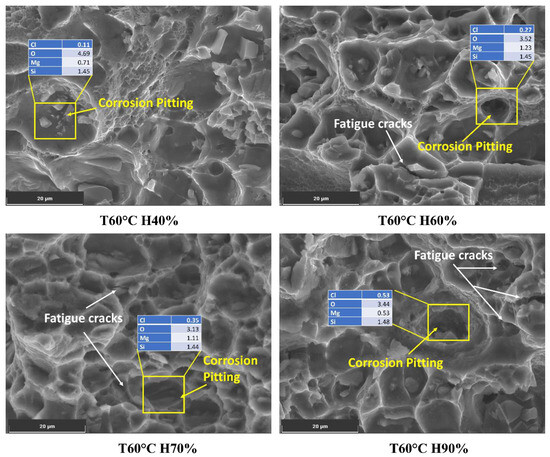 At 60 °C and 40% humidity, the chloride content is relatively low (0.11%), which may result in minimal localized corrosion. As humidity increases to 60%, 70%, and 90%, the chloride content rises to 0.27%, 0.35%, and 0.53%, respectively, as shown in Figure 8. The presence of chloride ions in these pits facilitates crack initiation and accelerates crack growth rates. As the crack propagates, it encounters varying microstructures, including the phase particles present in the Al6082 alloy. The reduced O value from 4% to 3% with increasing humidity indicates a more reduced oxide layer caused by an increment in the chloride ions. Furthermore, the observed decrease in Mg and Si levels below their actual values suggests that these alloying elements may participate in corrosion processes, leading to material degradation and a reduction in corrosion resistance. This promotes corrosion processes and further leads to accelerated corrosion and crack initiation.